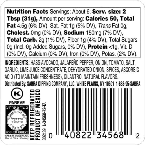IngredientsHass Avocado, Jalapeno Pepper, Onion, Tomato, Salt, Garlic, Lime Juice Concentrate, Dehydrated Onion, Spices, Ascorbic Acid (To Maintain Freshness), Cilantro, Natural Flavors.