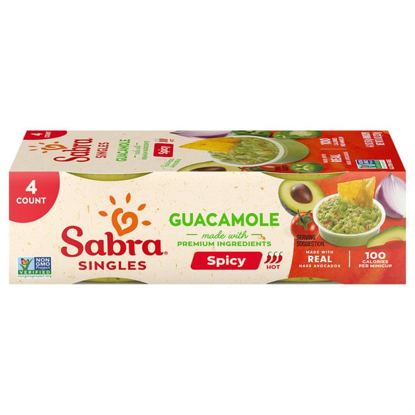 Sabra Singles Spicy Guacamole Cups are the ultimate ready-to-eat snacks for your busy Summer days. Our authentic recipe combines ripe, hand-scooped, Mexican-grown Hass avocados, fresh jalapenos, fragrant cilantro, and tangy lime juice. This fiery chunky guacamole dip tastes just like homemade but comes in perfectly portioned 100-calorie single-serve packs that are ready to eat anytime. Sabra Guacamole Spicy Singles cups are perfect for everyday snacking. Whether you’re enjoying lunch outside at work, packing camp lunches, or looking for an afternoon treat, this spicy dip is a game-changer on gluten-free chips, tacos, and more. In addition to Spicy guacamole, Sabra also offers single-serve Classic Guacamole. For a fast, delicious breakfast, try Sabra Breakfast Avocado Toast, a creamy avocado spread made with Hass avocados and served alongside crispy whole wheat bread, or Sabra Snackers for a quick bite to eat. No matter the occasion, Sabra has a snack for you.