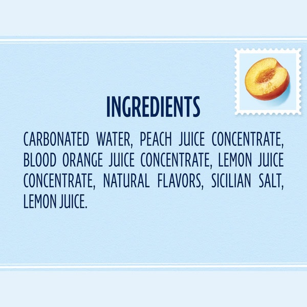 Carbonated Water, Peach Juice Concentrate, Blood Orange Juice Concentrate, Lemon Juice Concentrate, Natural Flavors, Sicilian Salt, Lemon Juice.