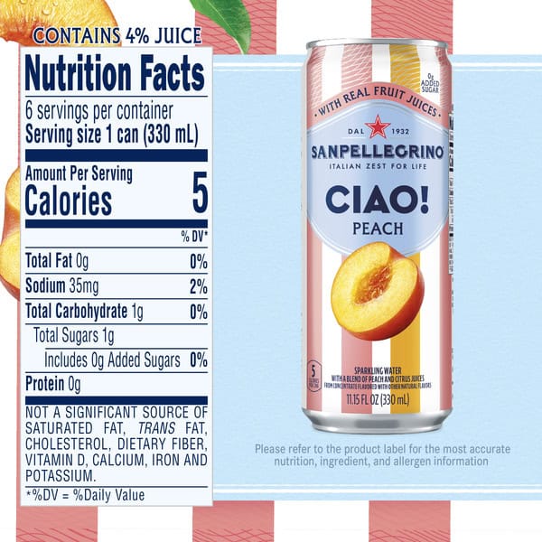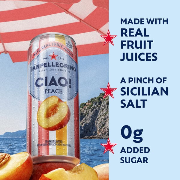 • ITALIAN ZEST FOR LIFE: Get ready to say CIAO! to an experience inspired by the Italian Zest for Life with our Sanpellegrino CIAO! Peach flavored sparkling water. It’s a refreshing experience best served chilled