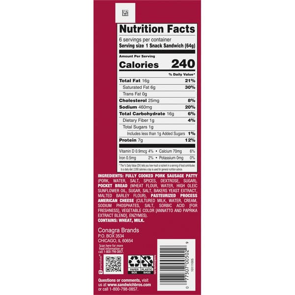 Fully Cooked Pork Sausage Patty (pork, Water, Salt, Spices, Dextrose, Sugar), Pocket Bread (wheat Flour, Water, High Oleic Sunflower Oil, Sugar, Salt, Bakers Yeast Extract, Malted Barley Flour), Pasteurized Process American Cheese (cultured Milk, Water, Cream, Sodium Phosphates, Salt, Sorbic Acid [for Freshness], Vegetable Color [annatto And Paprika Extract Blend], Enzymes).