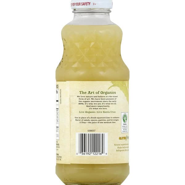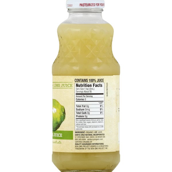 100% lime juice. Not from concentrate. 0 calories per 1 tsp. Non GMO Project verified. nongmoproject.org. USDA organic. Pasteurized for your safety. Glass recycles. The Art of Organics: We love nature and believe it’s the truest form of art. We have been pioneers of the organic movement since the early 1970s. It’s who we are. It’s what we do. And more importantly, it’s what we love. Live organic. Live Santa Cruz. Certified renewable energy. Green-e: We match 100% of our electricity use with certified renewable energy. Gluten free. Contains 100% juice. santacruzorganic.com. Certified organic by Quality Assurance International. Juice from Mexico.
