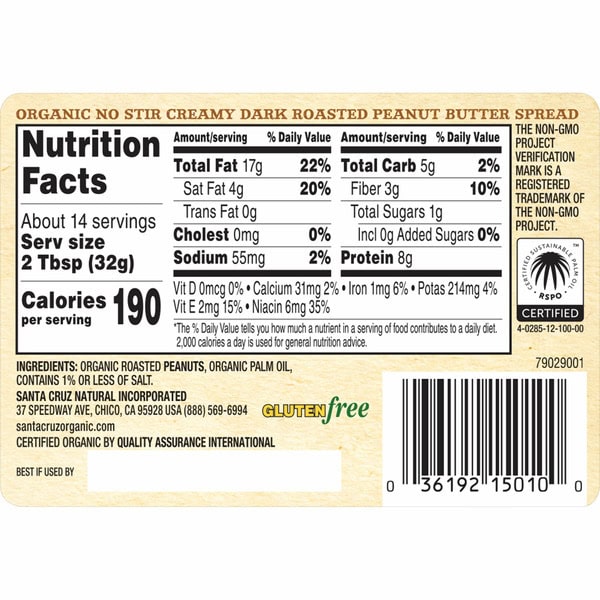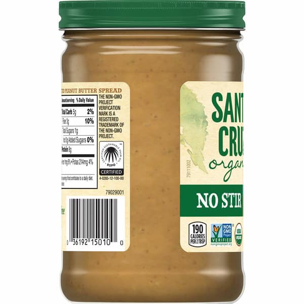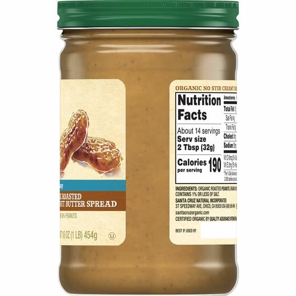 Santa Cruz Organic No Stir Creamy Dark Roasted Peanut Butter Spread is made from organic peanuts, palm oil, and just a dash of salt. We dark roast our peanuts to create a complex, robust flavor, then we blend it until it’s creamy and spreads smoothly without stirring. This simple recipe contains no artificial ingredients, and it’s also Non-GMO Project Verified and gluten free. Whether you spread it on a sandwich, bake it into cookies, or use it as a dip for your favorite fruits and veggies, Santa Cruz Organic No Stir Creamy Dark Roasted Peanut Butter Spread is the snack your family will go to time and again.