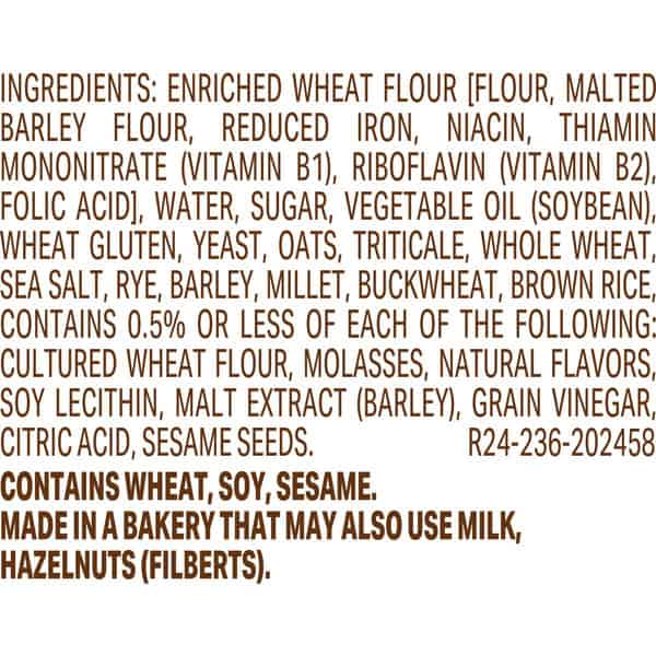 Enriched Wheat Flour [flour, Malted Barley Flour, Reduced Iron, Niacin, Thiamin Mononitrate (vitamin B1), Riboflavin (vitamin B2), Folic Acid], Water, Sugar, Vegetable Oil (soybean), Wheat Gluten, Yeast, Oats, Triticale, Whole Wheat, Sea Salt, Rye, Barley, Millet, Buckwheat, Brown Rice, Contains 0.5% Or Less Of Each Of The Following: Cultured Wheat Flour, Molasses, Natural Flavors, Soy Lecithin, Malt Extract (barley), Grain Vinegar, Citric Acid, Sesame Seeds