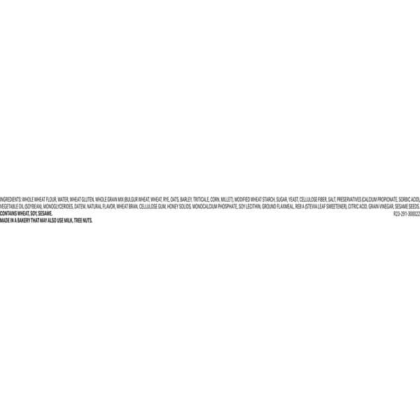 Whole Wheat Flour, Water, Wheat Gluten, Whole Grain Mix (bulgur Wheat, Wheat, Rye, Oats, Barley, Triticale, Corn, Millet), Modified Wheat Starch, Sugar, Yeast, Cellulose Fiber, Salt, Preservatives (calcium Propionate, Sorbic Acid), Vegetable Oil (soybean), Monoglycerides, Datem, Natural Flavor, Wheat Bran, Cellulose Gum, Honey Solids, Monocalcium Phosphate, Soy Lecithin, Ground Flaxmeal, Reb A (stevia Leaf Sweetener), Citric Acid, Grain Vinegar, Sesame Seeds