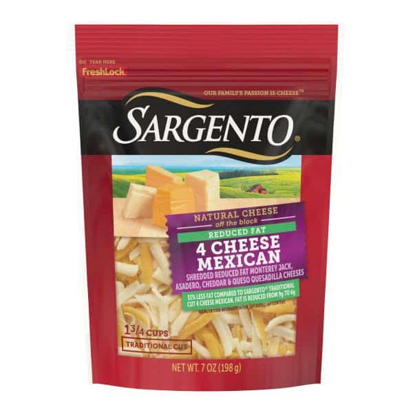 Shredded natural reduced fat monterey jack, cheddar, queso quesadilla & asadero cheese. Only from Sargento. Slide-rite freshness seal. Made with 2% milk. 33% less fat. 25% fewer calories. 2 cups. Compared to Sargento 4 Cheese Mexican Cheese. Our family’s passion is cheese. For exciting new ways to enjoy Reduced Fat Cheese visit sargento.com. 1/4 cup of this Sargento shredded cheese provides 250 mg of the 800-1200 mg of calcium most of us need each day. Fat is reduced from 9 grams to 6 grams. Calories are reduced from 110 to 80. Product of USA.