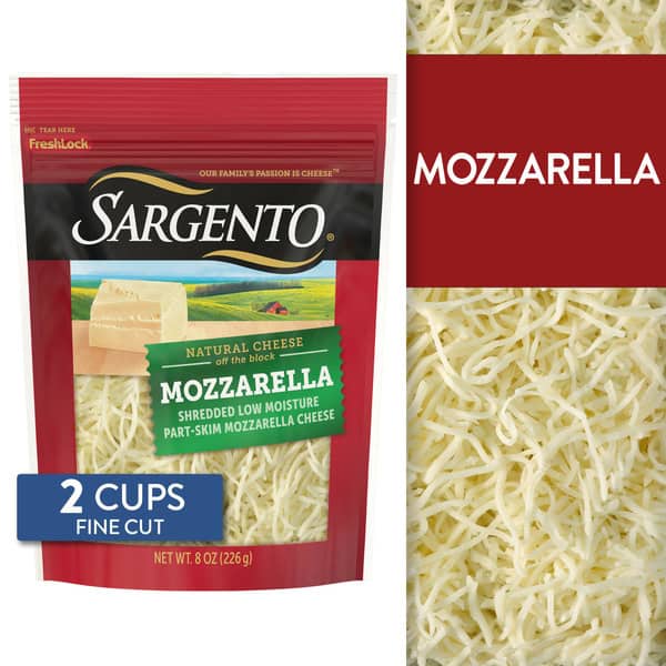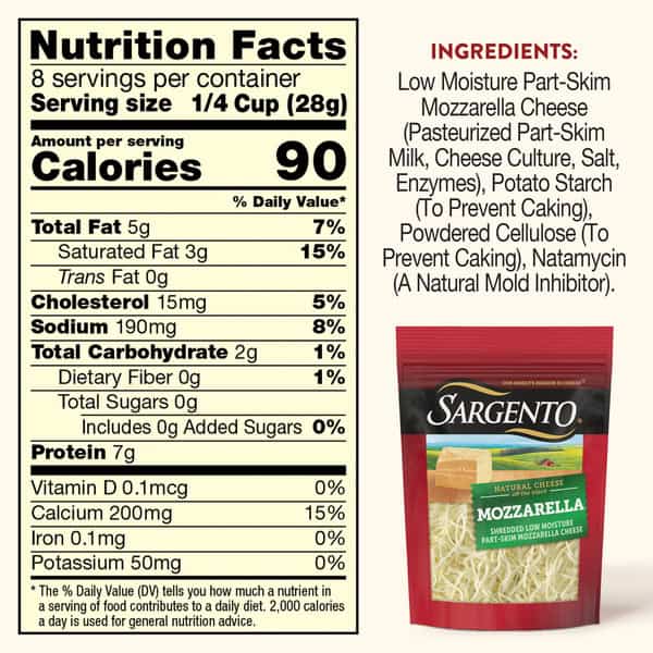 Low Moisture Part-skim Mozzarella Cheese (pasteurized Part-skim Milk, Cheese Culture, Salt, Enzymes), Potato Starch (to Prevent Caking), Powdered Cellulose (to Prevent Caking), Natamycin (a Natural Mold Inhibitor)
