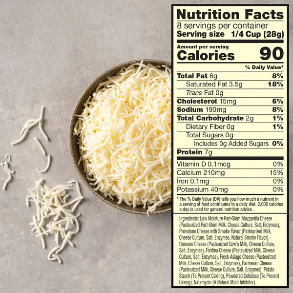 Low Moisture Part-skim Mozzarella Cheese (pasteurized Part-skim Milk, Cheese Culture, Salt, Enzymes), Provolone Cheese With Smoke Flavor (pasteurized Milk, Cheese Culture, Salt, Enzymes, Natural Smoke Flavor), Romano Cheese (pasteurized Cow’s Milk, Cheese Culture, Salt, Enzymes), Fontina Cheese (pasteurized Milk, Cheese Culture, Salt, Enzymes), Fresh Asiago Cheese (pasteurized Milk, Cheese Culture, Salt, Enzymes), Parmesan Cheese (pasteurized Milk, Cheese Culture, Salt, Enzymes), Potato Starch (to Prevent Caking), Powdered Cellulose (to Prevent Caking), Natamycin (a Natural Mold Inhibitor)