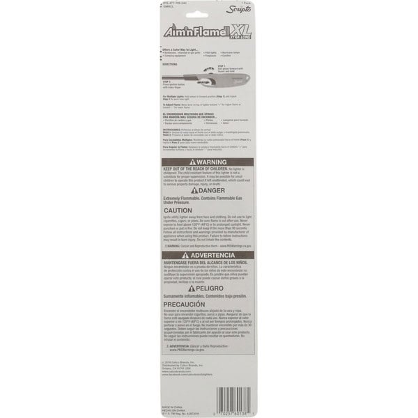 Warning: Cancer and Reproductive Harm – www.P65Warnings.ca.gov., Danger: Extremely flammable. Contents under pressure. Read carefully all warnings and instructions on back of package., Danger: Extremely Flammable. Contains flammable gas under pressure. Caution: Ignite utility lighter away from face and clothing. Do not use to light cigarettes, cigars, or pipes. Be sure flame is out after use. Never expose to heat above 120 degrees F (49 degrees C) or to prolonged sunlight Never puncture or put in fire. Do not keep lit for more than 30 seconds. Follow all instructions and warnings provided by manufacturer of appliance when using this product. Failure to follow instructions may result in bum injury. Do not inhale the contents., Warning: Keep out of the reach of children. No lighter is childproof. The child resistant feature of this lighter is not a substitute for proper supervision. It may be possible for small children to operate this product if left unattended, which could lead to serious property damage, injury, or death.