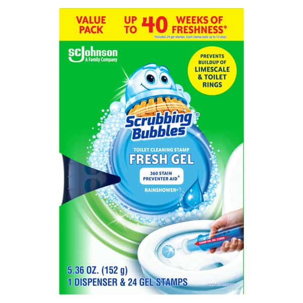 Scrubbing Bubbles Fresh Gel Toilet Cleaning Stamp provides freshness with every flush. Simply apply one of the Rainshower scented toilet bowl gel stamps under the rim. Each automatic toilet cleaner disc lasts up to 12 days. Scrubby calls it a hands-free way to help keep toilet rings and limescale build-up away.