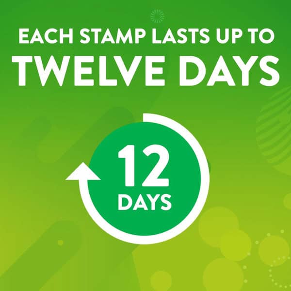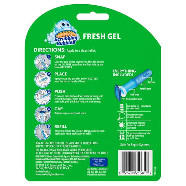 The Scrubbing Bubbles Fresh Gel Toilet Cleaning Stamp provides freshness with every flush. Simply stamp one of the toilet cleaning gel discs under the rim. Each stamp lasts up to 12 days! No touching. No scrubbing. No anything. Just continuous, flush-activated, freshening action. Scrubby calls it a hands-free way to help keep toilet rings and limescale build-up away. Stamp color may vary depending on fragrance. Odor-eliminating freshness every time you flush. That’s cleaning reinvented.
