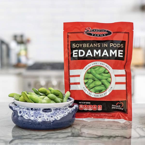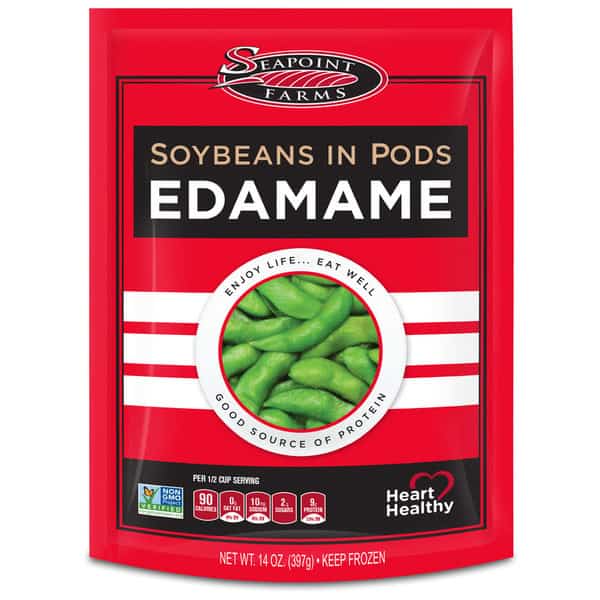 Soybeans in pods. Enjoy life, eat well. Great source of protein. Per 1/2 Cup Serving: 100 calories; 0.5 g sat fat (2% DV); 15 mg sodium (1% DV); 1 g sugars; 10 g protein (20% DV). Non GMO Project verified. nongmoproject.org. Gluten free. Heart healthy. At Seapoint Farms we believe in harvesting the healthy way with naturally grown, nutrient rich foods. Our Edamame (ed-ah-mah-may) is packed with plant based protein, fiber and the power of soy. 25 grams of soy protein a day, as part of a diet low in saturated fat and cholesterol may reduce the risk of heart disease. This little green gem nourishes your heart and your soul. www.seapointfarms.com. Product of China.