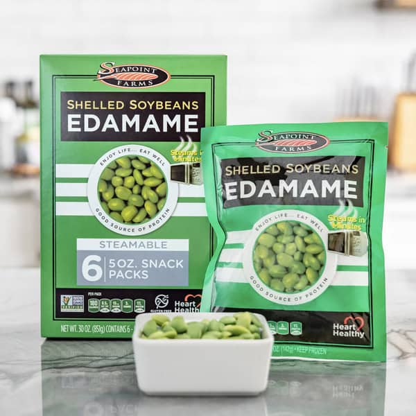 Per Pack: 180 calories; 0.5 g sat fat (3% DV); 15 mg sodium (0% DV); 3 g sugars; 17 g protein (25% DV). Gluten free. Heart healthy. Good source of protein. Non GMO Project verified. nongmoproject. Enjoy life – eat well. Steams in minutes. Steamable. At Seapoint Farms we believe in harvesting the healthy way with naturally grown, nutrient rich foods. Our Edamame (ed-ah-mah-may) is packed with plant-based protein and fiber. Diets low in saturated fat and cholesterol, and as low as possible in trans-fat, may reduce the risk of heart disease. This little green gem nourishes your heart and your soul. www.seapointfarms.com. Product of China.