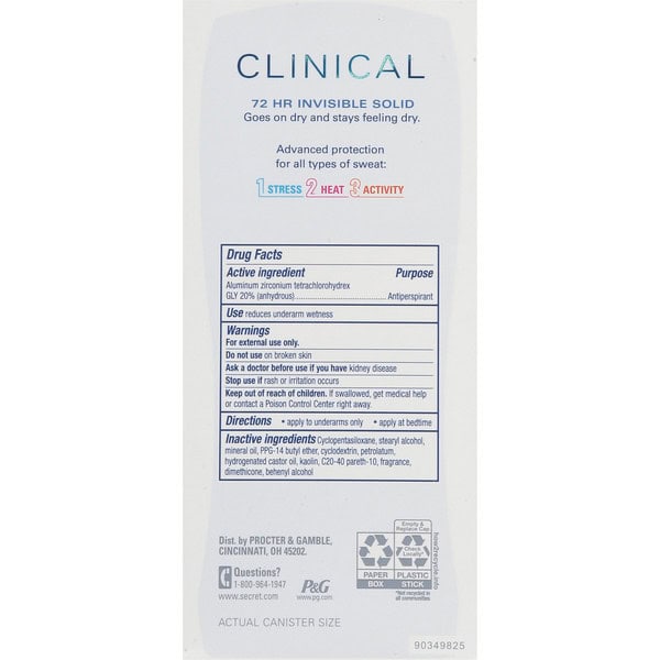 Secret Clinical Strength Antiperspirant and Deodorant for Women is clinically proven protection for 3 types of sweat; 1) stress sweat, 2) heat sweat and 3) activity sweat. It goes on dry and stays dry with 8x sweat activated odor fighters vs Secret Original Invisible Solid. Secret Clinical Strength Antiperspirant and Deodorant for Women Invisible Solid-incredible protection, no matter what the day may bring. Also available in soft solid and clear gel.