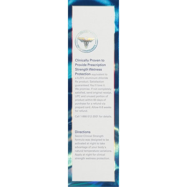 Directions: Apply to underarms only. Apply at bedtime. Directions: Secret Clinical Strength formula was designed to be activated at night to take advantage of your body’s natural temperature variations. Apply at night for clinical strength wetness protection.