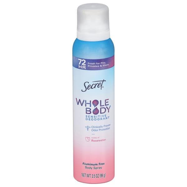 Sweat happens everywhere, but with Secret, ?stink doesn’t have to.? Say goodby to multiple daily showers, with Secret Whole Body Spray, you can smell better everywhere from your pits to your privates and more! Our Secret Whole Body Deodorant was created to use on your underarms, underboobs, thighs, privates, feets and more! Secret Whole Body is also Dermotologist teste, so you don’t have to try it out and hope for the best. It’s aluminum free, free of dyes, parabens, phthalates and is made to be gentle on skin.