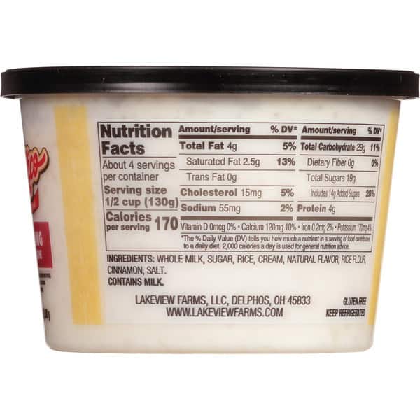 Whole Milk, Sugar, Rice, Water, Cream, Rice Flour, Potassium Sorbate To Preserve Freshness, Food Starch-modified (corn), Natural & Artificial Flavor, Cinnamon, Dextrose, Carrageenan, Salt, Dipotassium Phosphate, Vitamin D-3.