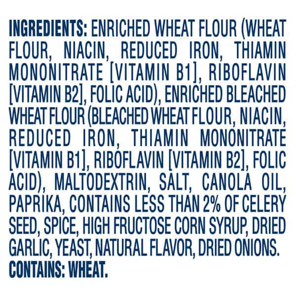Enriched Wheat Flour (wheat Flour, Niacin, Reduced Iron, Thiamin Mononitrate [vitamin B1], Riboflavin [vitamin B2], Folic Acid), Enriched Bleached Wheat Flour (bleached Wheat Flour, Niacin, Reduced Iron, Thiamin Mononitrate [vitamin B1], Riboflavin [vitamin B2], Folic Acid), Maltodextrin, Salt, Canola Oil, Paprika, Contains Less Than 2% Of Celery Seed, Spice, High Fructose Corn Syrup, Dried Garlic, Yeast, Natural Flavor, Dried Onions