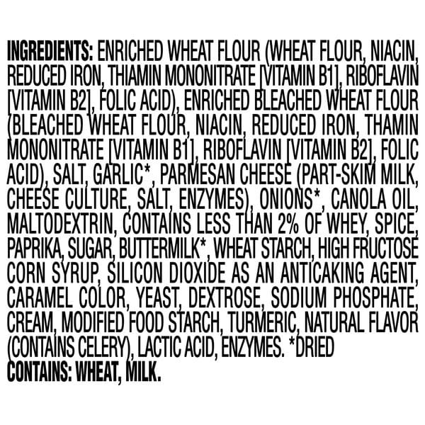 Enriched Wheat Flour (wheat Flour, Niacin, Reduced Iron, Thiamin Mononitrate [vitamin B1], Riboflavin [vitamin B2], Folic Acid), Enriched Bleached Wheat Flour (bleached Wheat Flour, Niacin, Reduced Iron, Thamin Mononitrate [vitamin B11, Riboflavin [vitamin B2], Folic Acid), Salt, Garlic, Parmesan Cheese (part-skim Milk, Cheese Culture, Salt, Enzymes), Onions*, Canola Oil, Maltodextrin, Contains Less Than 2% Of Whey, Spice, Paprika, Sugar, Buttermilk*, Wheat Starch, High Fructose Corn Syrup, Silicon Dioxide As An Anticaking Agent, Caramel Color, Yeast, Dextrose, Sodium Phosphate, Cream, Modified Food Starch, Turmeric, Natural Flavor (contains Celery), Lactic Acid, Enzymes.