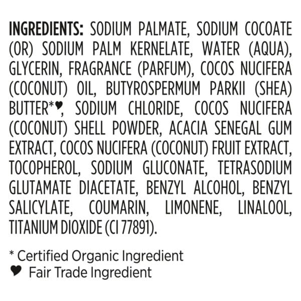 Sodium Palmate, Sodium Palm Kernelate, Water, Glycerin, Fragrance, Sodium Gluconate, Cocos Nucifera (coconut) Oil, Titanium Dioxide (ci 77891), Palm Acid, Sodium Chloride, Butyrospermum Parkii (shea) Butter*♥, Palm Kernel Acid, Cocos Nucifera (coconut) Shell Powder, Cocos Nucifera (coconut) Fruit Powder, Acacia Senegal Gum, Xanthan Gum, *certified Organic Ingredient, ♥fair Trade Ingredient