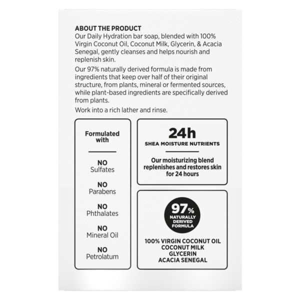 Our new 100% Virgin Coconut Oil Daily Hydration Bar soap is designed specifically for melanin-rich skin. Infused with 100% Virgin Coconut Oil, Coconut Milk, Glycerin & Acacia Senegal, this bar soap works to nourish and replenish skin, leaving it feeling soft, smooth, and visibly moisturized for 24 hours. Our moisturizing Bar soap is formulated with fair trade Shea Butter. Through our proprietary Shea Emulsion technology, we were able to break down Shea Butter into thousands of droplets that provide even, smooth coverage across the skin. This bar soap is 92% naturally derived and free from sulfates, parabens, phthalates, mineral oil, and petrolatum. For best results, use this bar soap in combination with other products from SheaMoisture’s 100% Virgin Coconut Oil Collection.