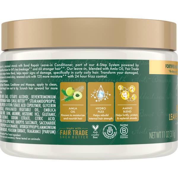 Stronger, healthier hair is just four simple steps away with our 4-step bond repair system, infused with restorative hydroplex infusion for 84% less breakage* and 6x stronger hair*. Blended with amla oil, fair trade shea butter, and our unique amino blend, bond repair shampoo is designed to repair signs of damage, specifically in curly, coily hair. Transform damaged, brittle hair by adding shine, softness, and 12x more moisture.