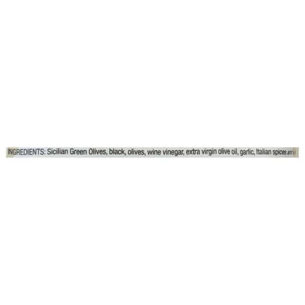 Sicilian Green Olives, Black Olives, Wine Vinegar, Extra Virgin Olive Oil, Garlic, Italian Spices and Salt.