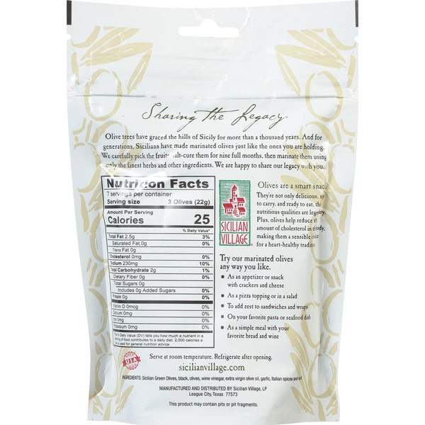 Authentic Sicilian family recipe. Sharing the Legacy: Olive trees have graced the hills of Sicily for more than a thousand years. And for generations, Sicilians have made marinated olives just like the ones you are holding. We carefully pick the fruits, salt-cure them for nine full months, then marinate them using only the finest herbs and other ingredients. We are happy to share our legacy with you. Olives are a smart snack. They’re not only delicious, easy to carry, and ready to eat, their nutritious qualities are legendary. Plus, olives help reduce the amount of cholesterol in the body, making them a sensible choice for a heart-healthy tradition.