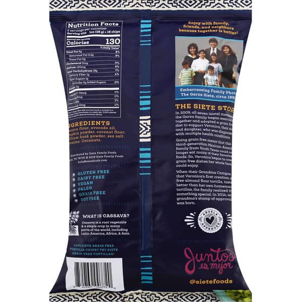 Made with 100% avocado oil. Certified gluten-free. Non GMO Project verified. nongmoproject.org. Round & dippable. What is cassava? Cassava is a root vegetable and staple crop in many parts of the world, including Latin America, Africa, and Asia. Enjoy with family, friends, and neighbors because together is better! The Siete Story: In 2009, all seven (siete) members of the Garza family began exercising together and adopted a gran free diet to support Veronica, their sister and daughter, who was diagnosed with multiple autoimmune conditions. Going grain free meant that this third-generation Mexican-American family from South Texas could no longer eat many of their favorite foods, so Veronica began to create grain free dishes her whole family could enjoy. When their Grandma Campos said that Veronica’s first creation, a grain free almond flour tortilla, tasted better than her own homemade flour tortillas, the family realized they had something special. In 2014, with their grandma’s stamp of approval, Siete was born. Abuela approved. sietefoods.com. nongmoproject.org. (at)sietefoods. Love Siete Grain Free Tortilla Chips? Try Siete Grain Free Tortillas!