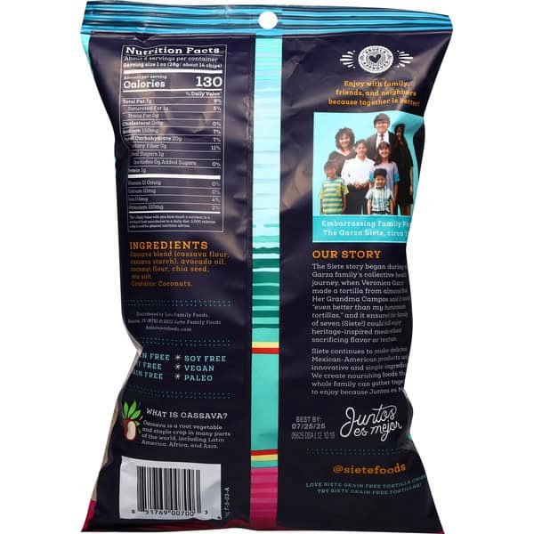 Made with 100% avocado oil. Certified gluten-free. Grain free & gluten free. Paleo & vegan friendly. Dairy free & soy free. Made in a dedicated gluten-free facility. Paleo. Grain free. Non GMO Project verified. nongmoproject.org. Light & crispy. What is cassava? Cassava is a root vegetable and staple crop in many parts of the world, including Latin America, Africa, and Asia. Enjoy with family, friends, and neighbors because together is better! The Siete Story: In 2009, all seven (siete) members of the Garza family began exercising together and adopted a gran free diet to support Veronica, their sister and daughter, who was diagnosed with multiple autoimmune conditions. Going grain free meant that this third-generation Mexican-American family from South Texas could no longer eat many of their favorite foods, so Veronica began to create grain free dishes her whole family could enjoy. When their Grandma Campos said that Veronica’s first creation, a grain free almond flour tortilla, tasted better than her own homemade flour tortillas, the family realized they had something special. In 2014, with their grandma’s stamp of approval, Siete was born. Abuela approved. sietefoods.com. (at)sietefoods. Love Siete Grain Free Tortilla Chips? Try Siete Grain Free Tortillas!