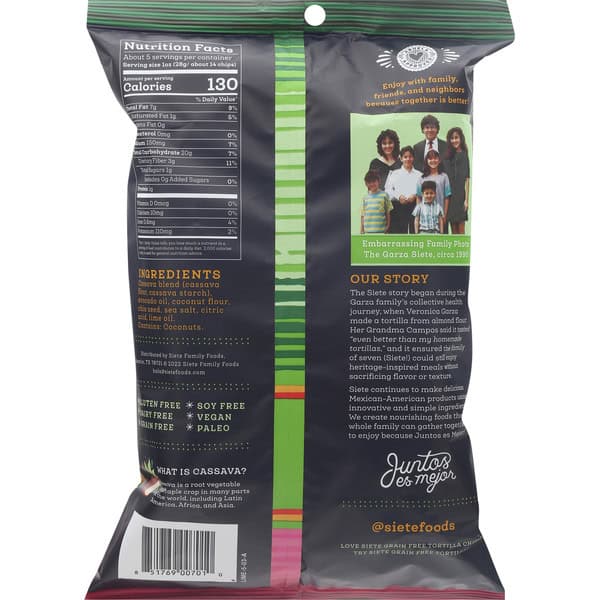 Made with 100% avocado oil. Vegan. Dairy free. Certified gluten-free. Soy free. Paleo. Grain free. Non GMO Project verified. nongmoproject.org. Bold flavor. What is cassava? Cassava is a root vegetable and staple crop in many parts of the world, including Latin America, Africa, and Asia. Enjoy with family, friends, and neighbors because together is better! The Siete Story: In 2009, all seven (siete) members of the Garza family began exercising together and adopted a gran free diet to support Veronica, their sister and daughter, who was diagnosed with multiple autoimmune conditions. Going grain free meant that this third-generation Mexican-American family from South Texas could no longer eat many of their favorite foods, so Veronica began to create grain free dishes her whole family could enjoy. When their Grandma Campos said that Veronica’s first creation, a grain free almond flour tortilla, tasted better than her own homemade flour tortillas, the family realized they had something special. In 2014, with their grandma’s stamp of approval, Siete was born. Abuela approved. sietefoods.com. (at)sietefoods. Love Siete Grain Free Tortilla Chips? Try Siete Grain Free Tortillas!