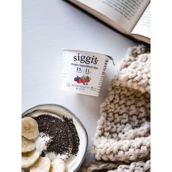 • One 5.3-ounce cup of siggi’s Mixed Berries & Acai Icelandic-Style Nonfat Yogurt,