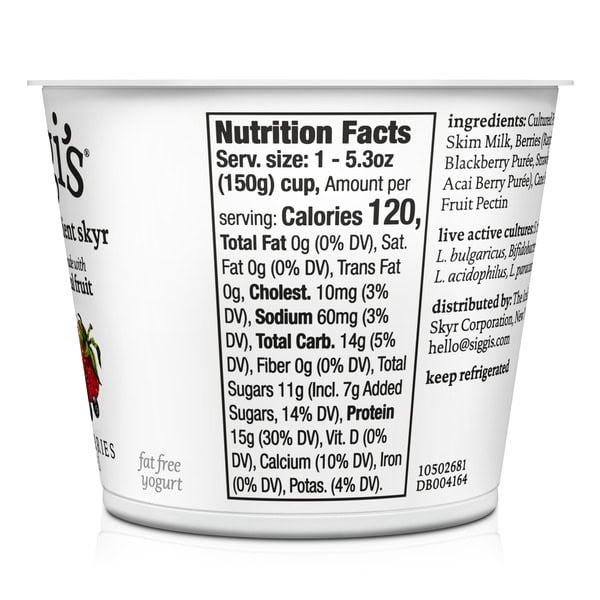 siggi’s Mixed Berries & Acai Icelandic-Style Nonfat Strained Yogurt is an ode to a deeply rooted Scandinavian dairy tradition that has been a part of Icelandic culture for centuries. siggi’s founder wasn’t thrilled with the overly sweet and artificial taste of other US yogurt brands, inspiring him to create yogurt crafted with less. Each cup of siggi’s nonfat skyr uses 4x the amount of milk than a regular cup of yogurt — making it rich in protein. siggi’s skyr is thick and creamy — ideal as a nonfat addition to breakfast, a nutritious snack, or an easy afternoon pick-me-up. Pair with your favorite toppings, like fresh berries and granola, or enjoy as is. Our nonfat mixed berries & acai yogurt cups contain 5 simple ingredients including real fruit and no artificial anything. Gluten-free and kosher, if you like our strained mixed berry & acai yogurt, try our full line of products, including skyr, drinkable yogurt, plant-based blends, and yogurt pouches.,