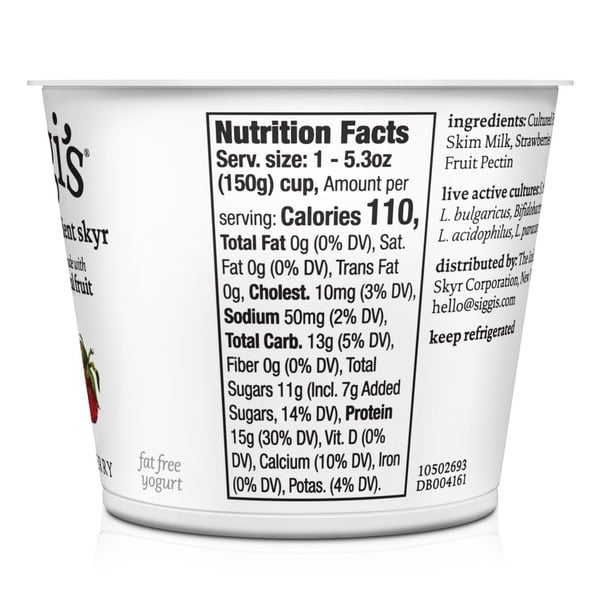 siggi’s Strawberry Icelandic-Style Nonfat Strained Yogurt is an ode to a deeply rooted Scandinavian dairy tradition that has been a part of Icelandic culture for centuries. siggi’s founder wasn’t thrilled with the overly sweet and artificial taste of other US yogurt brands, inspiring him to create yogurt crafted with less. Each cup of siggi’s nonfat strawberry skyr uses 4x the amount of milk than a regular cup of yogurt — making it rich in protein. siggi’s skyr is thick and creamy — ideal as a nonfat addition to breakfast, a nutritious snack, or an easy afternoon pick-me-up. Pair with your favorite toppings, like fresh berries and granola, or enjoy as is. Our nonfat strawberry yogurt cups contain 5 simple ingredients including real fruit and no artificial anything. Gluten-free and kosher, if you like our strained strawberry yogurt, try our full line of products, including skyr, drinkable yogurt, plant-based blends, and yogurt pouches.,