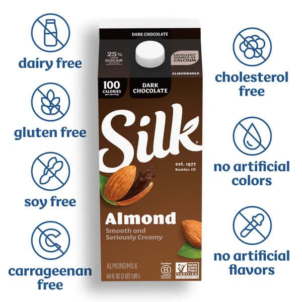 Treat yourself to this smooth and seriously creamy Silk Dark Chocolate Almondmilk. Enjoy all of the taste with 25% less sugar than dairy chocolate milk*. Made with three kinds of almonds grown by Mother Nature and picked at the peak of ripeness, this lactose free milk has a perfect mix of quality and flavor. Plus, its smooth flavor makes it an extraordinary tasting plant based milk that you can use throughout your day. It tastes great in a glass or in your favorite smoothies. Every serving of this non dairy milk is an excellent source of calcium and has Vitamin D to help support strong bones. Silk Almondmilk is totally free of dairy, soy, lactose, gluten, casein, egg, carrageenan, and MSG. Whether you’re making a bowl of healthy cereal, drinking straight out of a glass or enjoying a frothy coffee, trust Silk — the Original Plant Pioneer. Today Silk supports regenerative agriculture because we believe in the power of plants for people and the planet. It’s not just almondmilk, it’s Milk of the Land**. Read more about our story on our packaging. Enjoy all of the Silk products, including gluten free vegan milk, non dairy creamers and dairy free yogurt varieties. *See Nutrition Facts for sugar and calorie content. **From plants, not cows. Not nutritionally equivalent to dairy milk.