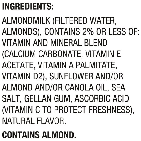Almondmilk (filtered Water, Almonds), Contains 2% Or Less Of: Vitamin And Mineral Blend (calcium Carbonate, Vitamin E Acetate, Vitamin A Palmitate, Vitamin D2), Sunflower And/or Almond And/or Canola Oil, Sea Salt, Gellan Gum, Ascorbic Acid (vitamin C To Protect Freshness), Natural Flavor