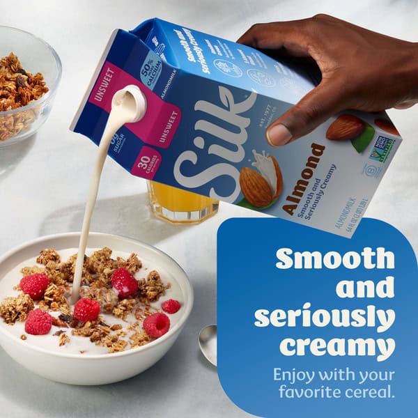Treat yourself to this smooth and seriously creamy Silk Unsweet Almondmilk. Enjoy all of the taste with 0 grams of sugar per serving*. Made with three kinds of almonds grown by Mother Nature and picked at the peak of ripeness, this lactose free milk has a perfect mix of quality and flavor. Plus, its smooth flavor makes it an extraordinary tasting plant based milk that you can use throughout your day. It tastes great in a bowl of cereal or in your favorite smoothies. Every serving of this non dairy milk has Vitamin D to help support strong bones and 50% more calcium than dairy milk**. Silk Almondmilk is totally free of dairy, soy, lactose, gluten, casein, egg, and MSG. Looking for lactose free cooking or baking supplies? Silk Almondmilk makes an excellent addition to sauces and baked goods. Whether you’re making a bowl of healthy cereal, drinking straight out of a glass or enjoying a frothy coffee, trust Silk — the Original Plant Pioneer. Today Silk supports regenerative agriculture because we believe in the power of plants for people and the planet. It’s not just almondmilk, it’s Milk of the Land***. Read more about our story on our packaging. Enjoy all of the Silk products, including vegan milk, non dairy creamers and dairy free yogurt varieties. *See Nutrition Facts for sugar and calorie content. **Silk Almondmilk: 470mg of calcium per cup; reduced fat dairy milk: 309mg of calcium per cup. USDA FoodData central, 2022. ***From plants, not cows. Not nutritionally equivalent to dairy milk.
