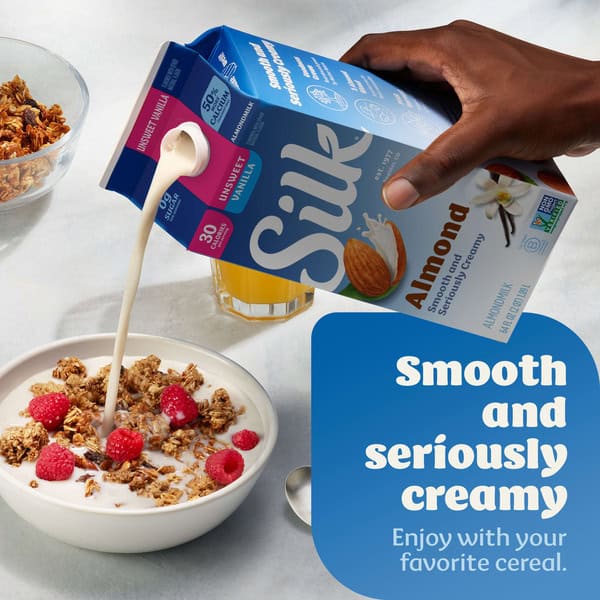 Treat yourself to this smooth and seriously creamy Silk Vanilla Unsweet Almondmilk. Enjoy all of the taste with 0 grams of sugar per serving*. Made with three kinds of almonds grown by Mother Nature and picked at the peak of ripeness, this lactose free milk has a perfect mix of quality and flavor. Plus, its smooth vanilla flavor makes it an extraordinary tasting plant based milk that you can use throughout your day. It tastes great in a bowl of cereal or in your favorite smoothies. Every serving of this non dairy milk has Vitamin D to help support strong bones and 50% more calcium than dairy milk**. Silk Almondmilk is totally free of dairy, soy, lactose, gluten, casein, egg, and MSG. Looking for lactose free cooking or baking supplies? Silk Almondmilk makes an excellent addition to sauces and baked goods. Whether you’re making a bowl of cereal, drinking straight out of a glass or enjoying it as a non dairy coffee creamer for a frothy coffee, trust Silk — the Original Plant Pioneer. Today Silk supports regenerative agriculture because we believe in the power of plants for people and the planet. It’s not just almondmilk, it’s Milk of the Land***. Read more about our story on our packaging. Enjoy all of the Silk products, including vegan milk, non dairy creamer and dairy free yogurt varieties. *See Nutrition Facts for sugar and calorie content. **Silk Unsweet Vanilla Almondmilk: 470mg of calcium per cup; reduced fat dairy milk: 309mg of calcium per cup. USDA FoodData central, 2022. ***From plants, not cows. Not nutritionally equivalent to dairy milk.