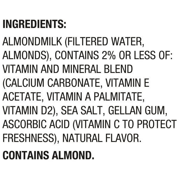 Almondmilk (filtered Water, Almonds), Contains 2% Or Less Of: Vitamin And Mineral Blend (calcium Carbonate, Vitamin E Acetate, Vitamin A Palmitate, Vitamin D2), Sea Salt, Gellan Gum, Ascorbic Acid (vitamin C To Protect Freshness), Natural Flavor