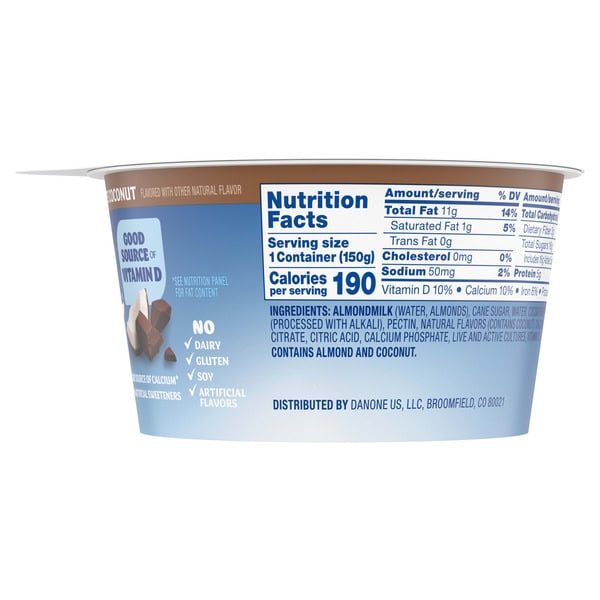 Indulge your taste buds in a delicious plant-based food with Silk Dark Chocolate Coconut Almondmilk Yogurt Alternative. This plant based, nondairy yogurt with live and active cultures is rich and creamy and doesn’t skimp on flavor. There are no artificial sweeteners in this dairy free yogurt, and it’s also a good source of calcium and vitamin D, making Silk almondmilk yogurt a great addition to your lifestyle. In addition, this dark chocolate coconut yogurt alternative boasts 5 grams of plant-powered protein per serving (4% DV). This vegan yogurt has no gluten, lactose, dairy, soy or cholesterol, so it’s a great choice for snackers. Use this dark chocolate coconut yogurt alternative in your next breakfast bowl, post-workout smoothie or yogurt parfait. Or, use as a tasty vegan snack. At Silk, we believe in the real power of plants to improve where we live and how well we live. Silk lactose free yogurt is verified by the Non-GMO Project’s product verification program. Silk Almondmilk Yogurt is also helping almond farmers implement regenerative agriculture practices. Learn more about our story on our packaging. Plus, Silk is a brand of Danone North America, a Certified B Corp, joining people using business as a force for good(TM).