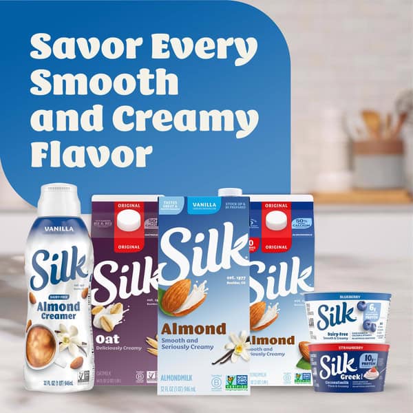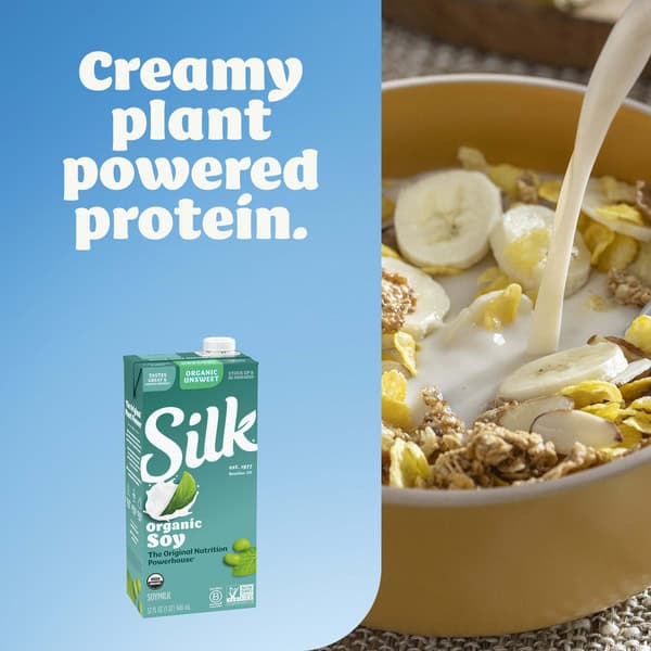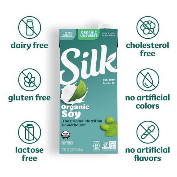 Treat yourself to shelf-stable Silk Unsweet Organic Soymilk. Made with whole harvested soybeans, this dairy free and lactose free plant based milk is the Original Nutrition Powerhouse. Enjoy all of the taste with 7 grams of protein per serving.* Plus, it’s an extraordinary tasting USDA certified organic plant based milk that you can use throughout your day. Every serving of this nondairy milk has Calcium and Vitamin D to help support strong bones. Silk Soymilk is totally free of dairy, lactose, gluten, cholesterol, artificial colors and artificial flavors. This shelf-stable unsweetened soymilk doesn’t require refrigeration, so you can stock up and store it for months without sacrificing taste. Whether you’re making a healthy smoothie, making a bowl of tasty cereal or drinking straight out of a glass, trust Silk — the Original Plant Pioneer. Enjoy more Silk products, including vegan milk, non dairy creamer and dairy free yogurt varieties. *Not a low calorie food.