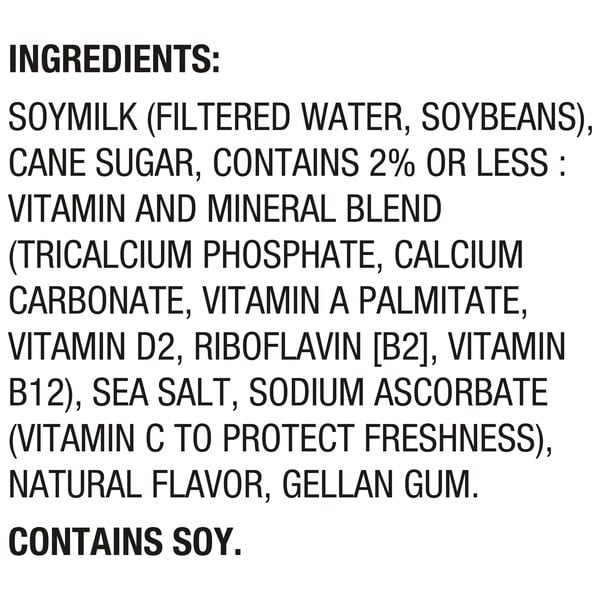 Soymilk (filtered Water, Soybeans), Cane Sugar, Contains 2% Or Less: Vitamin And Mineral Blend (tricalcium Phosphate, Calcium Carbonate, Vitamin A Palmitate, Vitamin D2, Riboflavin [b2], Vitamin B12), Sea Salt, Sodium Ascorbate (vitamin C To Protect Freshness), Natural Flavor, Gellan Gum