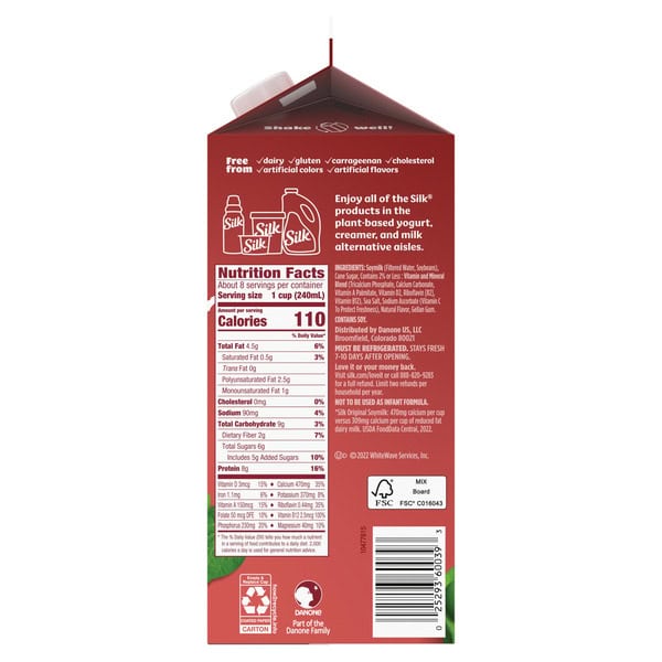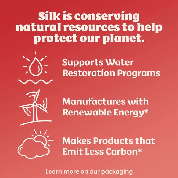 Treat yourself with Silk Original Soymilk. Made with whole harvested soybeans grown by Mother Nature, this lactose free milk is the Original Nutrition Powerhouse. Plus, it’s an extraordinary tasting plant based milk that you can use throughout your day. Every serving of this nondairy milk has 50% more calcium than dairy milk*, along with 8 grams of complete plant-based protein (16% DV). Silk Soymilk is totally free of dairy, gluten, carrageenan and cholesterol. Looking for lactose free cooking or baking supplies? Whether you’re making a healthy smoothie, making a bowl of tasty cereal or drinking straight out of a glass, trust Silk — the Original Plant Pioneer. Read more about our story on our packaging. Enjoy all of the Silk products, including vegan milk, non dairy creamer and dairy free yogurt varieties. *Silk Original Soymilk: 470mg calcium per cup; reduced fat dairy milk: 309mg calcium per cup. USDA, ARS. FoodData Central, 2022.