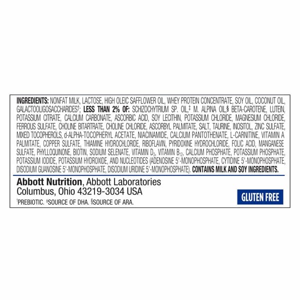 Nonfat Milk, Lactose, High Oleic Sunflower Oil, Whey Protein Concentrate, Soy Oil, Coconut Oil, Galactooligosaccharides†, Less Than 2% Of: Schizochytrium Sp. Oil,‡ M. Alpina Oil,§ Beta-carotene, Lutein, Potassium Citrate, Calcium Carbonate, Ascorbic Acid, Soy Lecithin, Magnesium Chloride, Ferrous Sulfate, Choline Bitartrate, Choline Chloride, Ascorbyl Palmitate, Salt, Potassium Chloride, Taurine, Inositol, Zinc Sulfate, Mixed Tocopherols, D-alpha-tocopheryl Acetate, Niacinamide, Calcium Pantothenate, L-carnitine, Vitamin A Palmitate, Copper Sulfate, Thiamin Hydrochloride, Riboflavin, Pyridoxine Hydrochloride, Folic Acid, Manganese Sulfate, Phylloquinone, Biotin, Sodium Selenate, Vitamin D₃, Vitamin B₁₂, Potassium Phosphate, Potassium Iodide, Potassium Hydroxide, And Nucleotides (adenosine 5′-monophosphate, Cytidine 5′-monophosphate, Disodium Guanosine 5′-monophosphate, Disodium Uridine 5′-monophosphate), †prebiotic, ‡source Of Dha, §source Of Ara