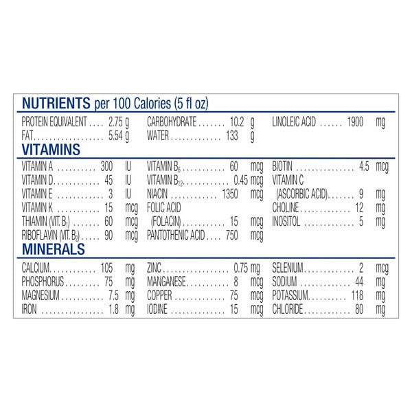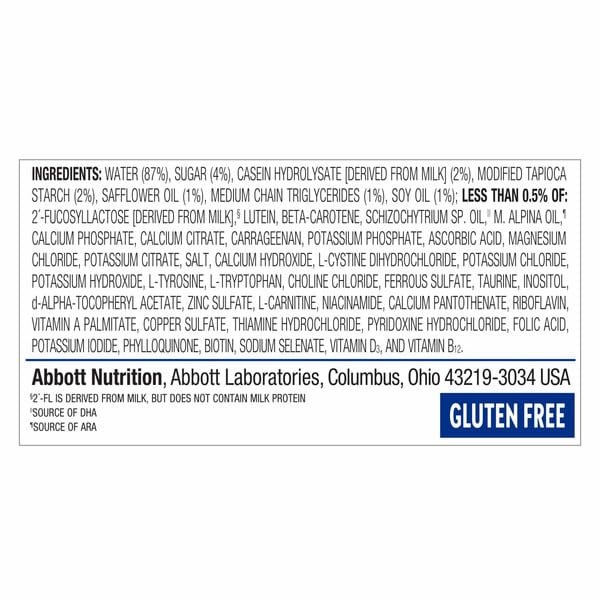 Water (87%), Sugar (4%), Casein Hydrolysate [derived From Milk] (2%), Modified Tapioca Starch (2%), Safflower Oil (1%), Medium Chain Triglycerides (1%), Soy Oil (1%), Less Than 0.5% Of: 2′-fucosyllactose [derived From Milk]§, Lutein, Beta-carotene, Schizochytrium Sp. Oil,ˡˡ M. Alpina Oil,¶ Calcium Phosphate, Calcium Citrate, Carrageenan, Potassium Phosphate, Ascorbic Acid, Magnesium Chloride, Potassium Citrate, Salt, Calcium Hydroxide, L-cystine Dihydrochloride, Potassium Chloride, Potassium Hydroxide, L-tyrosine, L-tryptophan, Choline Chloride, Ferrous Sulfate, Taurine, Inositol, D-alpha-tocopheryl Acetate, Zinc Sulfate, L-carnitine, Niacinamide, Calcium Pantothenate, Riboflavin, Vitamin A Palmitate, Copper Sulfate, Thiamine Hydrochloride, Pyridoxine Hydrochloride, Folic Acid, Potassium Iodide, Phylloquinone, Biotin, Sodium Selenate, Vitamin D₃ And Vitamin B₁₂, §2′-fl Is Derived From Milk But Does Not Contain Milk Protein, ˡˡsource Of Dha, ¶source Of Ara