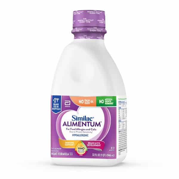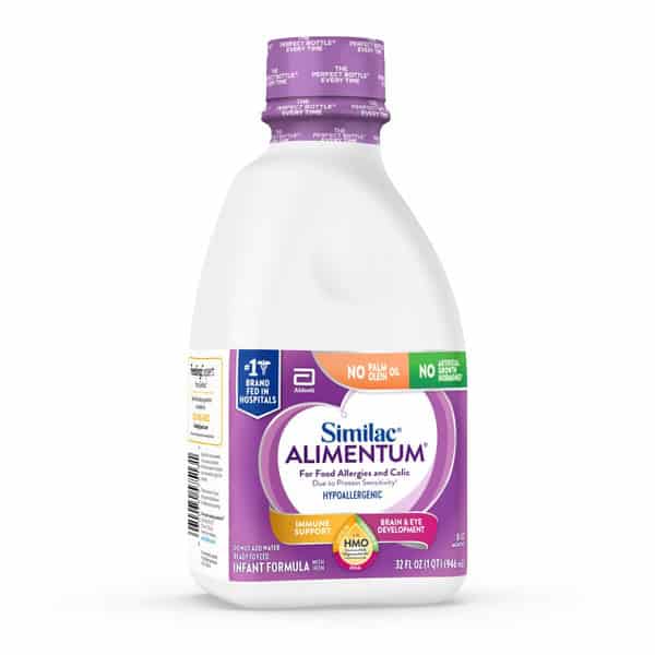Similac Alimentum infant formula with 2′-FL HMO is the first and only hypoallergenic infant formula with 2′-FL HMO, a unique immune-nourishing ingredient. It starts reducing colic symptoms due to protein sensitivity in most babies within 24 hours,* so your baby can start feeling better today.* *Based on a clinical study with Alimentum Ready to Feed without DHA, ARA, 2′-FL HMO, lutein, and beta-carotene. A crossover clinical study of infants experiencing colic symptoms due to cow’s milk protein sensitivity showed 5 of 6 infants initiated on Alimentum during the first week achieved a reduction in excessive crying. Data on File, Study AC84, August 2004. Abbott Nutrition, Columbus, Ohio.
