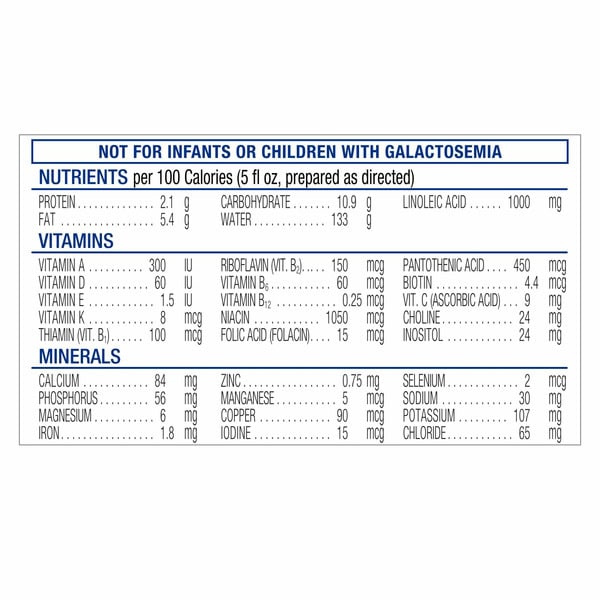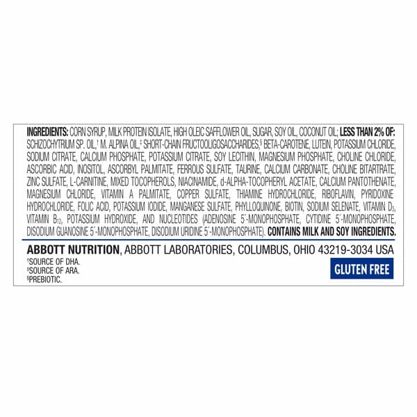 Corn Syrup, Milk Protein Isolate, High Oleic Safflower Oil, Sugar, Soy Oil, Less Than 2% Of: Schizochytrium Sp. Oil,† M. Alpina Oil,‡ Short-chain Fructooligosaccharidess,§ Beta-carotene, Lutein, Potassium Chloride, Sodium Citrate, Calcium Phosphate, Potassium Citrate, Soy Lecithin, Magnesium Phosphate, Choline Chloride, Ascorbic Acid, Inositol, Ascorbyl Palmitate, Ferrous Sulfate, Taurine, Calcium Carbonate, Choline Bitartrate, Zinc Sulfate, L-carnitine, Mixed Tocopherols, Niacinamide, D-alpha-tocopheryl Acetate, Calcium Pantothenate, Magnesium Chloride, Vitamin A Palmitate, Copper Sulfate, Thiamine Hydrochloride, Riboflavin, Pyridoxine Hydrochloride, Folic Acid, Potassium Iodide, Manganese Sulfate, Phylloquinone, Biotin, Sodium Selenate, Vitamin D₃, Vitamin B₁₂, Potassium Hydroxide, And Nucleotides (adenosine 5′-monophosphate, Cytidine 5′-monophosphate, Disodium Guanosine 5′-monophosphate, Disodium Uridine 5′-monophosphate), †source Of Dha, ‡source Of Ara, §prebiotic