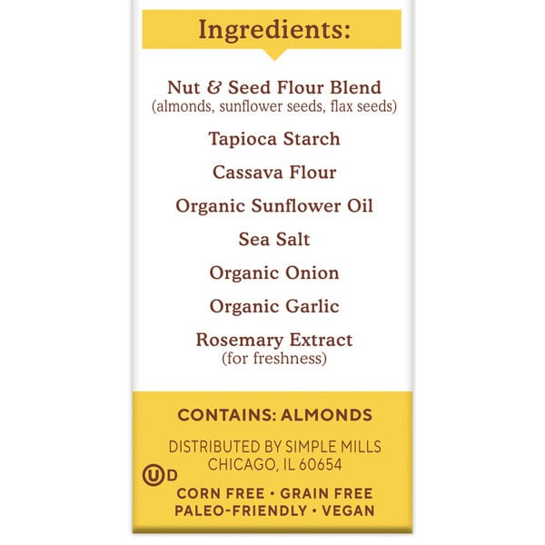 Nut and Seed Flour Blend (Almonds, Sunflower Seeds, Flax Seeds), Tapioca, Cassava, Organic Sunflower Oil, Sea Salt, Organic Onion, Organic Garlic, Rosemary Extract (for freshness)
