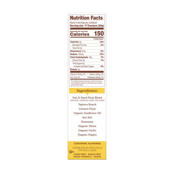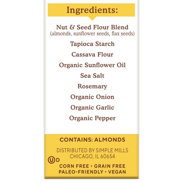 Nut and Seed Flour Blend (Almonds, Sunflower Seeds, Flax), Tapioca Starch, Cassava Flour, Organic Sunflower Oil, Sea Salt, Rosemary, Organic Onion, Organic Garlic, Organic Pepper
