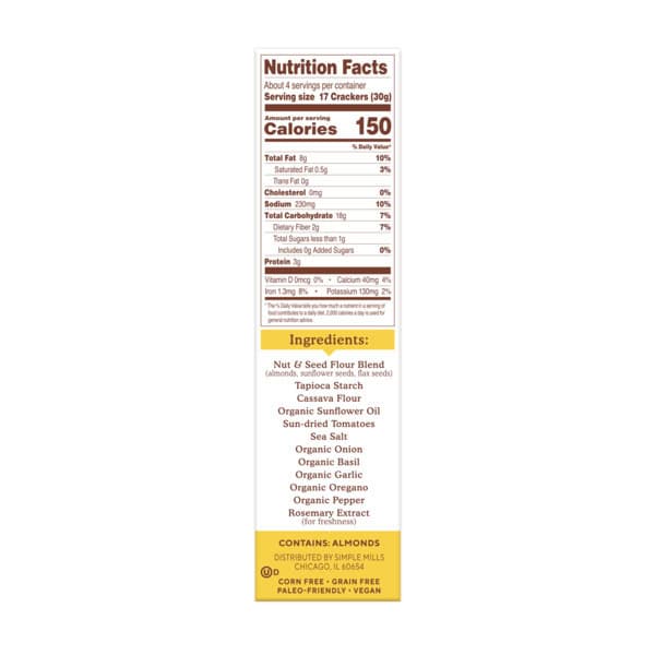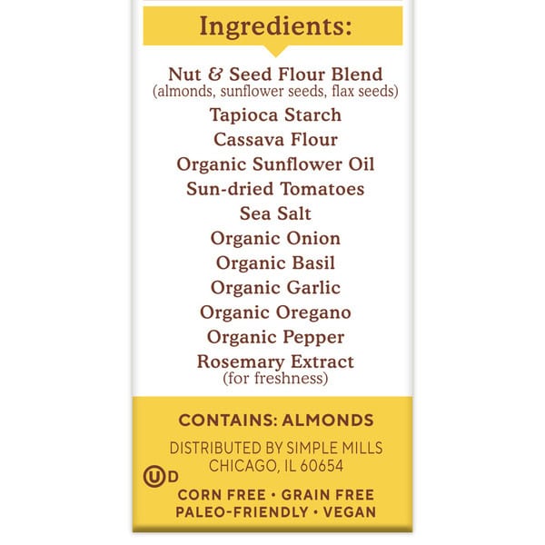 Nut & Seed Flour Blend (Almonds, Sunflower Seeds, Flax), Tapioca Starch, Cassava Flour, Organic Sunflower Oil, Sun-dried Tomatoes, Sea Salt, Organic Onion, Organic Basil, Organic Garlic, Organic Oregano, Organic Pepper, Rosemary Extract (For Freshness)